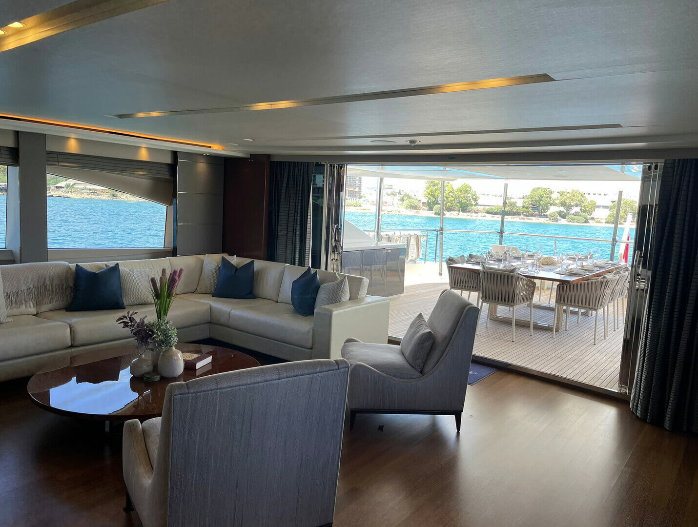 Le Verseau is decked out with all you require for relaxation and fun. Picture yourself unwinding in the deck jacuzzi, drink in hand, soaking up the views. Stay as connected as you like with onboard Wi-Fi, and never break a sweat (unless you want to) thanks to full air conditioning. She’s built to glide smoothly through the waters, cruising comfortably at 12 knots, with a top speed of 23 knots and a range that lets you explore far and wide.