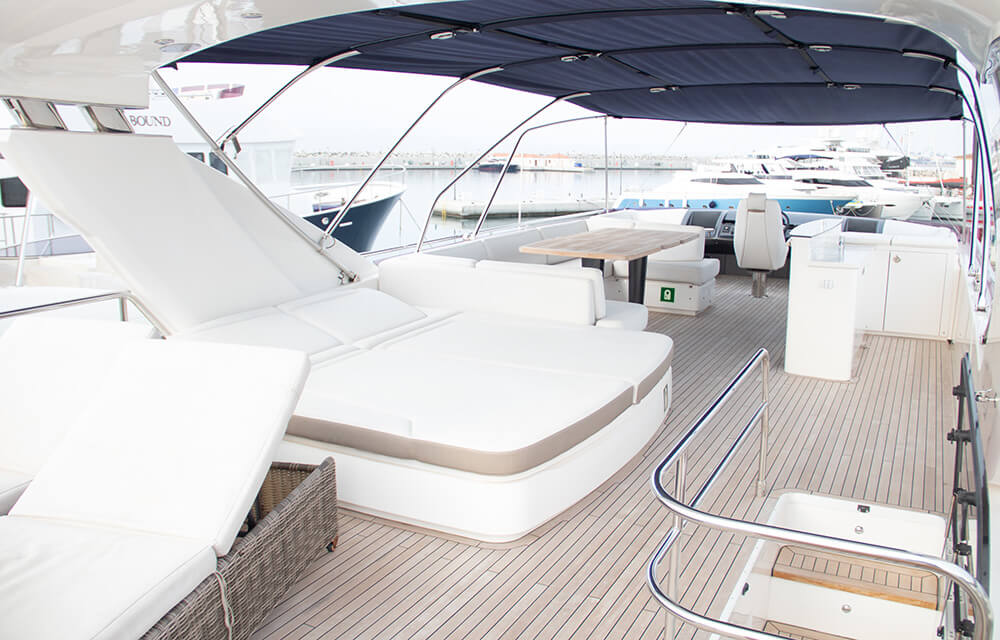 Up top, the flybridge isn’t just spacious; it’s a party-ready spot with cozy seats, a dining setup, helm seating, a wet bar, and a sunpad—plus, extra storage for all your goodies. Inside, the vibe is all about contemporary chic, making you feel right at home.