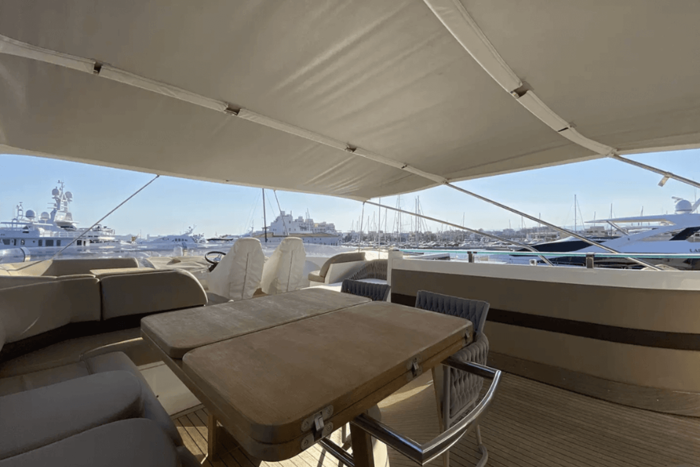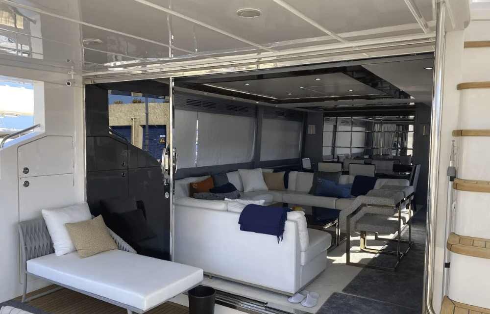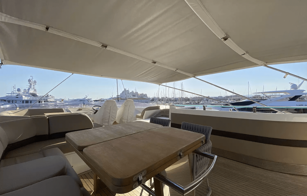 Inside, 4 sumptuous en-suite cabins sleep eight lucky guests in absolute comfort, while panoramic windows flood the salon with natural light. The flybridge is a sunsoaked haven, boasting plush sunpads, a wet bar, and plenty of space to entertain or unwind.